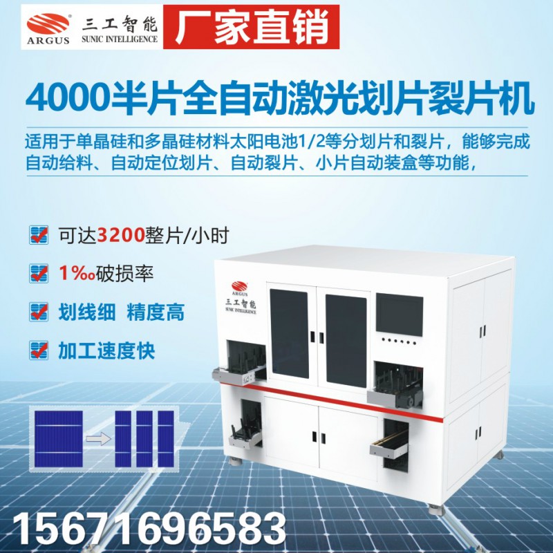 Applied to scribe&split mono-crystalline silicon and poly-crystalline silicon solar cell into 1/2 piece, which can achieve automatic cell loading,automatic positioning scribing,automatic cell splitting,small cell load in box automatically and so on.